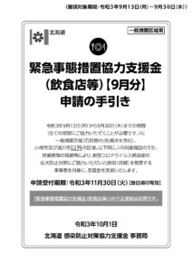 飲食店向け支援金(緊急事態措置協力支援金)9月分について